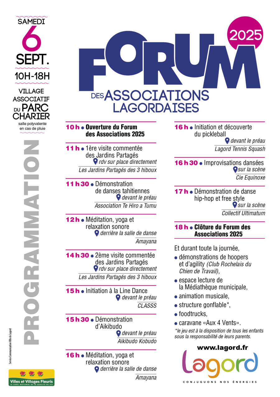 Programmé le SAMEDI 6 SEPTEMBRE, mais cette fois-ci toute la journée (de 10h à 18h), le Forum des Associations de Lagord 2025 vous dira tout, tout, tout sur les activités que propose le tissu associatif communal, tant dans les domaines de la citoyenneté, de la culture, de l’entraide, que du sport et des loisirs.