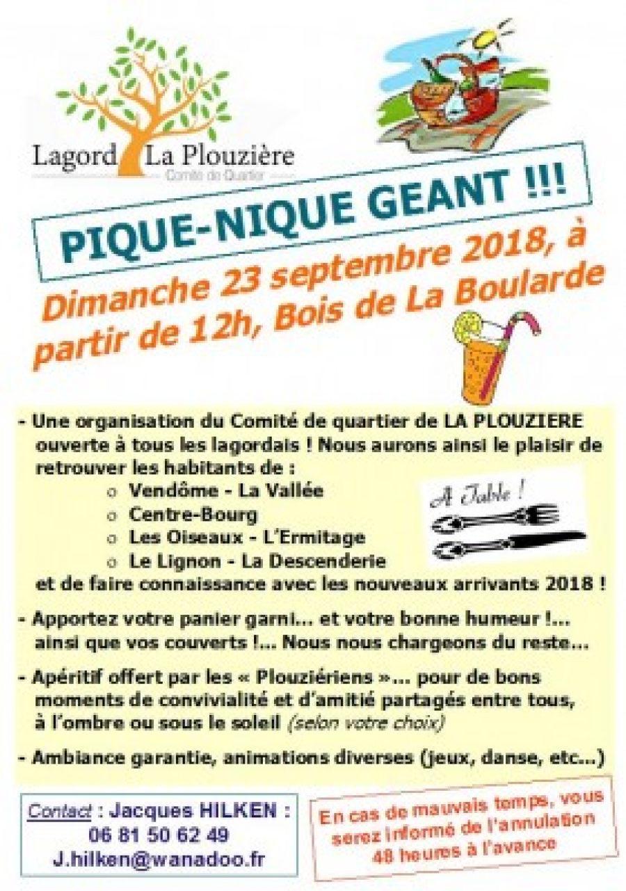Le Comité de Quartier Lagord - La Plouzière invite tous les Lagordais à venir participer à leur pique-nique géant dimanche 23 septembre au bois de la Boularde à partir de midi.